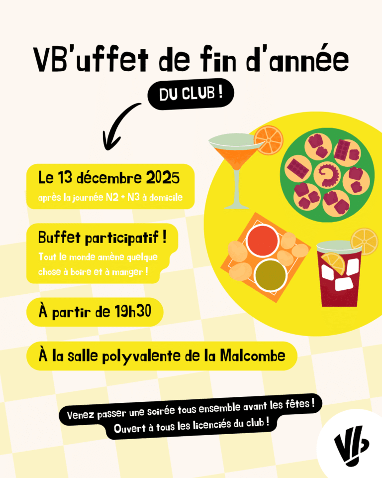 Ce samedi 13 décembre 2025, après la journée N2 + N3 à domicile, venez passer une soirée tous ensemble avant les fêtes ! Ouvert à tous les licenciés du club